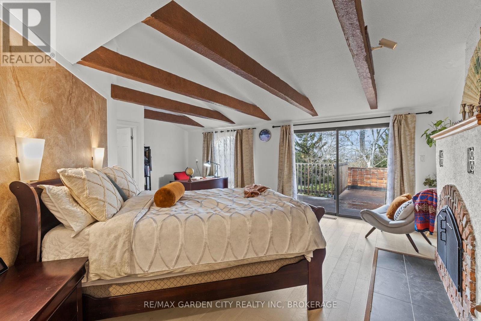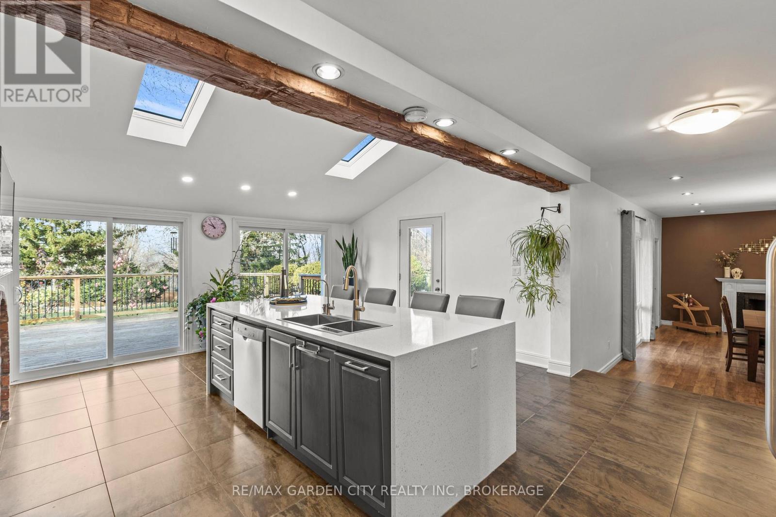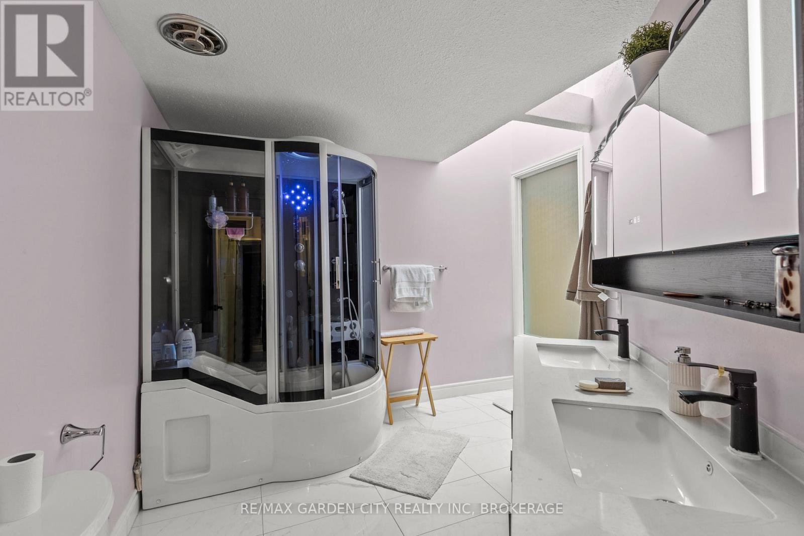 Exceptional 6-bedroom, 5-bathroom executive home in South St. Catharines, offering over 3,400 sq ft above grade on a premium 66 x 251 ft ravine lot with no rear neighbours, backing onto a green space paradise with in-ground pool. Well renovated between 2019-2025, this property provides outstanding space, privacy, and extensive upgrades throughout.The main floor features a bright home office with backyard views, a private living room with fireplace, a separate recreation/sitting area, and a main-floor sauna with direct outdoor access. The open kitchen offers quartz countertops, a large island, updated cabinetry, and a spacious dining area with oversized patio doors leading to the private backyard with an in-ground concrete pool. A convenient main-floor laundry and shower room complete this level.The second floor offers two unique primary suites. The west-facing suite includes vaulted ceilings, a fireplace, walk-in closet, private balcony, and renovated ensuite with skylight. The east-facing suite provides generous space and morning light. Three additional bedrooms feature private ensuites, and a large 4-piece bathroom services the remaining bedroom. The finished basement includes a recreation room, storage, and a second laundry area. Major updates include full second-floor renovation; multiple bathroom remodels; new kitchen (2021); new staircase, flooring, trims, casings, and baseboards; attic insulation and HVAC upgrades with humidifier and electric air cleaner (2019); spray-foam insulation above the garage; driveway rebuild; new fencing; artificial turf; shed foundation; extensive pool repairs and repainting; and new garage doors (2025). Premium located near the Pen Centre, Brock University, Highs chools, Ridley College, hospital, and major amenities. (id:10317)