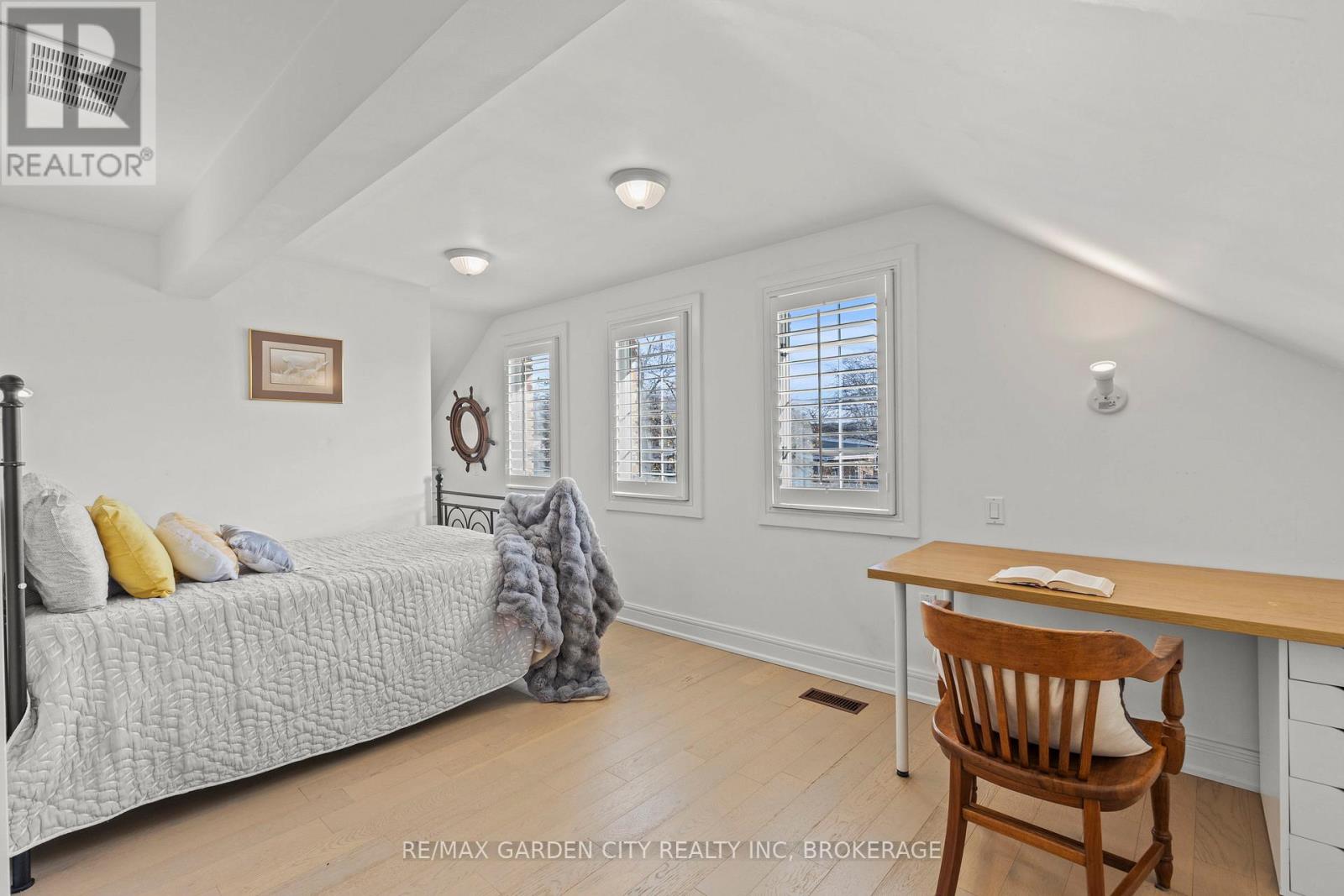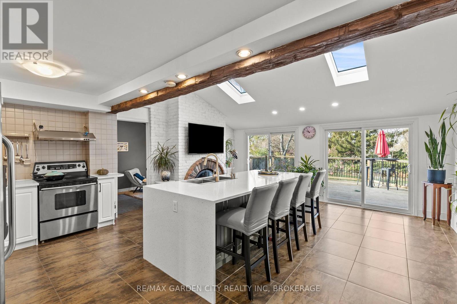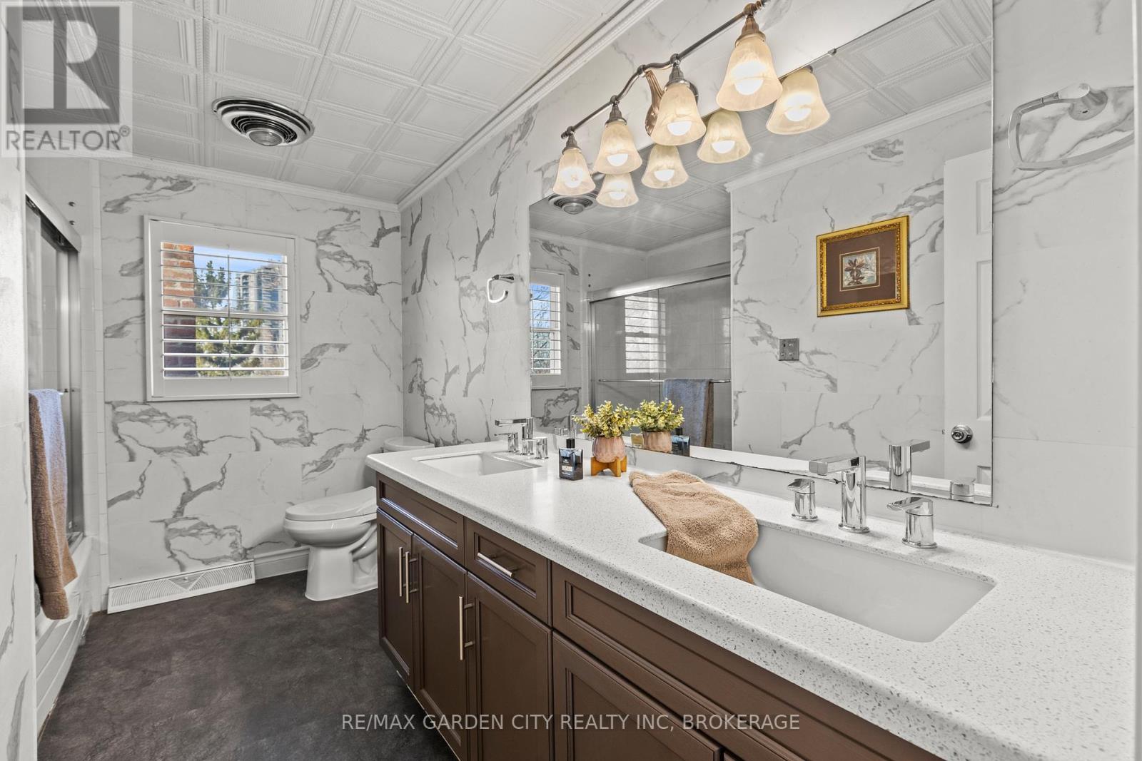 Exceptional 6-bedroom, 5-bathroom executive home in South St. Catharines, offering over 3,400 sq ft above grade on a premium 66 x 251 ft ravine lot with no rear neighbours, backing onto a green space paradise with in-ground pool. Well renovated between 2019-2025, this property provides outstanding space, privacy, and extensive upgrades throughout.The main floor features a bright home office with backyard views, a private living room with fireplace, a separate recreation/sitting area, and a main-floor sauna with direct outdoor access. The open kitchen offers quartz countertops, a large island, updated cabinetry, and a spacious dining area with oversized patio doors leading to the private backyard with an in-ground concrete pool. A convenient main-floor laundry and shower room complete this level.The second floor offers two unique primary suites. The west-facing suite includes vaulted ceilings, a fireplace, walk-in closet, private balcony, and renovated ensuite with skylight. The east-facing suite provides generous space and morning light. Three additional bedrooms feature private ensuites, and a large 4-piece bathroom services the remaining bedroom. The finished basement includes a recreation room, storage, and a second laundry area. Major updates include full second-floor renovation; multiple bathroom remodels; new kitchen (2021); new staircase, flooring, trims, casings, and baseboards; attic insulation and HVAC upgrades with humidifier and electric air cleaner (2019); spray-foam insulation above the garage; driveway rebuild; new fencing; artificial turf; shed foundation; extensive pool repairs and repainting; and new garage doors (2025). Premium located near the Pen Centre, Brock University, Highs chools, Ridley College, hospital, and major amenities. (id:10317)